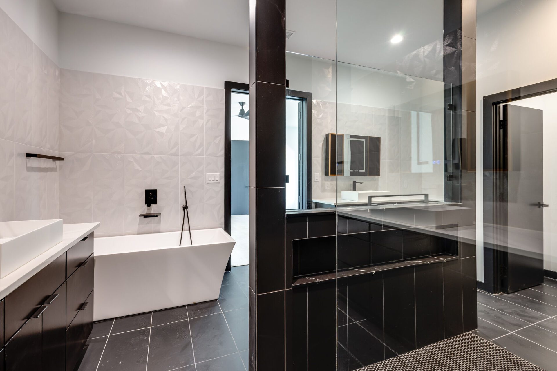The spacious primary suite features a king-sized walk-in closet with built-in organization, a spa-quality ensuite bathroom with cutting-edge smart technology, a walk-in shower, and an oversized soaking tub. The two additional bedrooms also feature built-in closets and ensuite bathrooms.