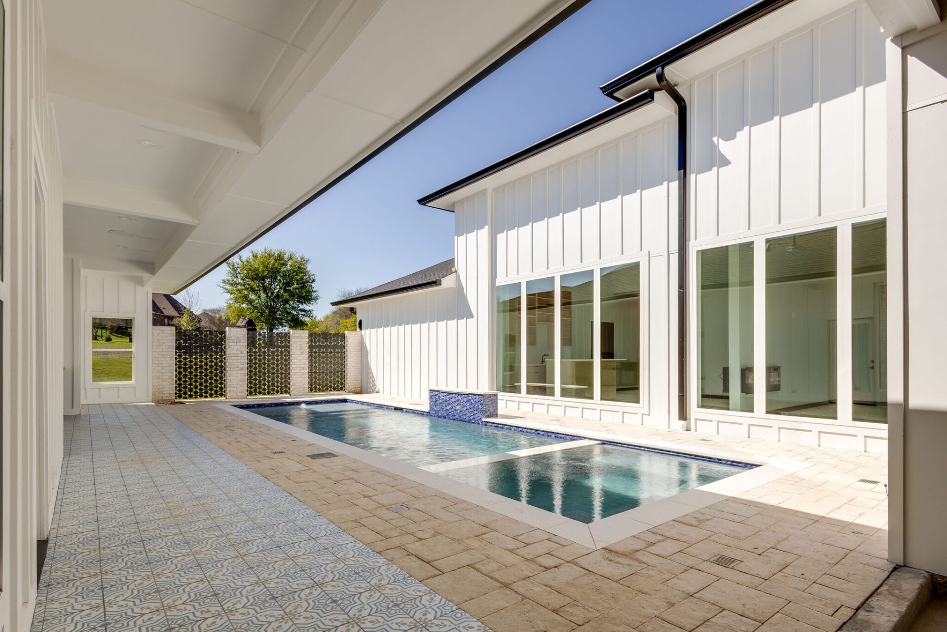 The home is centered around an interior outdoor oasis featuring a built-in pool, gorgeous tiling, abundant patio space, and a fully stocked outdoor cooking area with all the amenities. This spacious outdoor living area is perfect for hosting a cookout or escaping from the world to your own private paradise. Just off the outdoor entertaining space is a full bathroom with a shower.